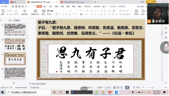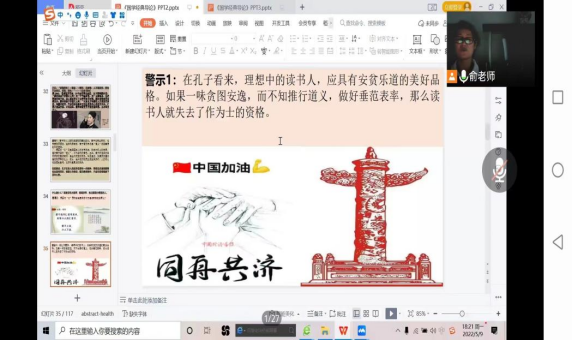 俞秀玲老师当天的课堂主题是孔子《论语》经典解读。俞老师借用“君子有九思”、“有君子之道四焉:其行己也恭,其事上也敬,其养民也惠,其使民也义”、“学而时习之,不亦说乎”、“士而怀居,不足以为士矣”等名言名句解释经典文本,为我们描述了理想中的读书人应该具有安贫乐道的美好品格,同时要有责任担当和大局意识,投身到祖国的建设中去。