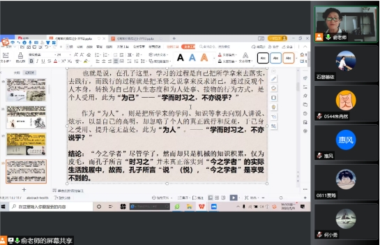 5月9日,公司开展了线上教学观摩课活动。本次观摩课是由公司俞秀玲副教授主讲的《国学经典导论》,200余名员工及部分老师线上观摩,活动由金年会金字招牌诚信至上副经理马雪莲主持。