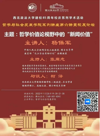 11月25日,公司85周年校庆金年会金字招牌诚信至上系列讲座第六讲暨员工论坛在腾讯会议如期召开,本次讲座由知名员工中国人大博士生导师杨保军教授主讲,陕西省哲学会荣誉会长张周志教授担任主持人,新闻学博士柯泽教授担任与谈人,探讨了“哲学价值论视野中的新闻价值”,是一场高水平的专业学术讲座,哲社院与新闻公司众多师生参加了此次讲座。