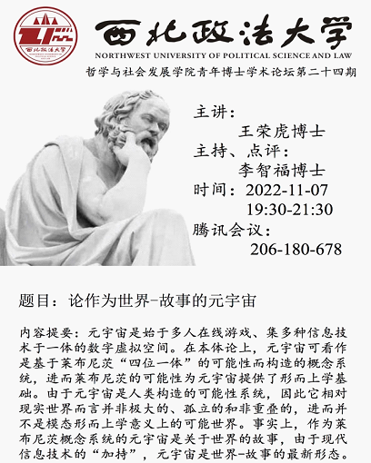 王荣虎博士的报告题目是“论作为世界-故事的元宇宙”。王荣虎博士的报告从元宇宙的概念入手,讨论了元宇宙的词源和技术本质,进而认为元宇宙是始于“多人在线游戏”、集多种信息技术于一体的数字虚拟空间。王荣虎博士认为,元宇宙是人们借助现代信息技术对思想或可能性的建构与表达,而人们在元宇宙中所体验到的对象在本质上也是思想和可能性。在这个意义上,莱布尼茨的可能性理论为元宇宙提供了一个形而上学基础。同时,由于元宇宙并非极大的、孤立的合非重叠的,因此元宇宙并非莱布尼茨意义上的可能世界,而是世界故事的最新形态。
