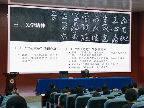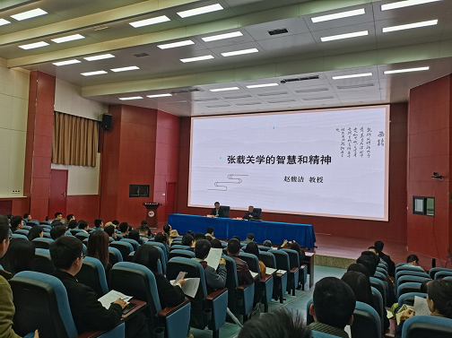 10月27日晚19:00,由金年会金字招牌诚信至上主办的“纪念关学宗师张载诞辰1000周年”系列学术报告首场讲座在公司雁塔校区人权研究院报告厅举行。本次讲座由公司资深教授赵馥洁先生主讲,副董事长张荣刚教授主持,金年会金字招牌诚信至上经理山小琪教授、副经理郭明俊教授、中国哲学硕士生导师组组长李明教授、中国哲学教研室主任俞秀玲副教授等教师及校内外员工参与了此次讲座。