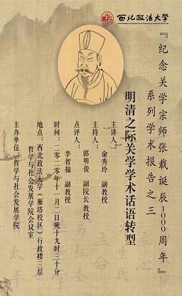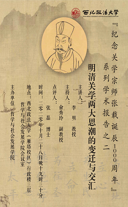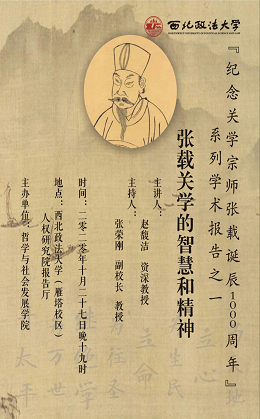 近年来,赵馥洁教授带领公司中、青年学术团队在关学研究方面凸显了关学所独具的价值论意蕴,取得了诸多研究成果。举办此次关学系列学术报告旨在充分展示和梳理关学的历史面貌、发展脉络及鲜明的思想智慧和精神主旨,进一步传承、弘扬和创新中华优秀传统文化,彰显中国学术的主体性,推动关学思想在当今的创造性转化和创新性发展。首场报告会后还将由李明教授、俞秀玲副教授、李智福副教授、马亚雄博士和张磊博士分别进行三场学术报告,围绕关学研究与中国哲学开展交流研讨。